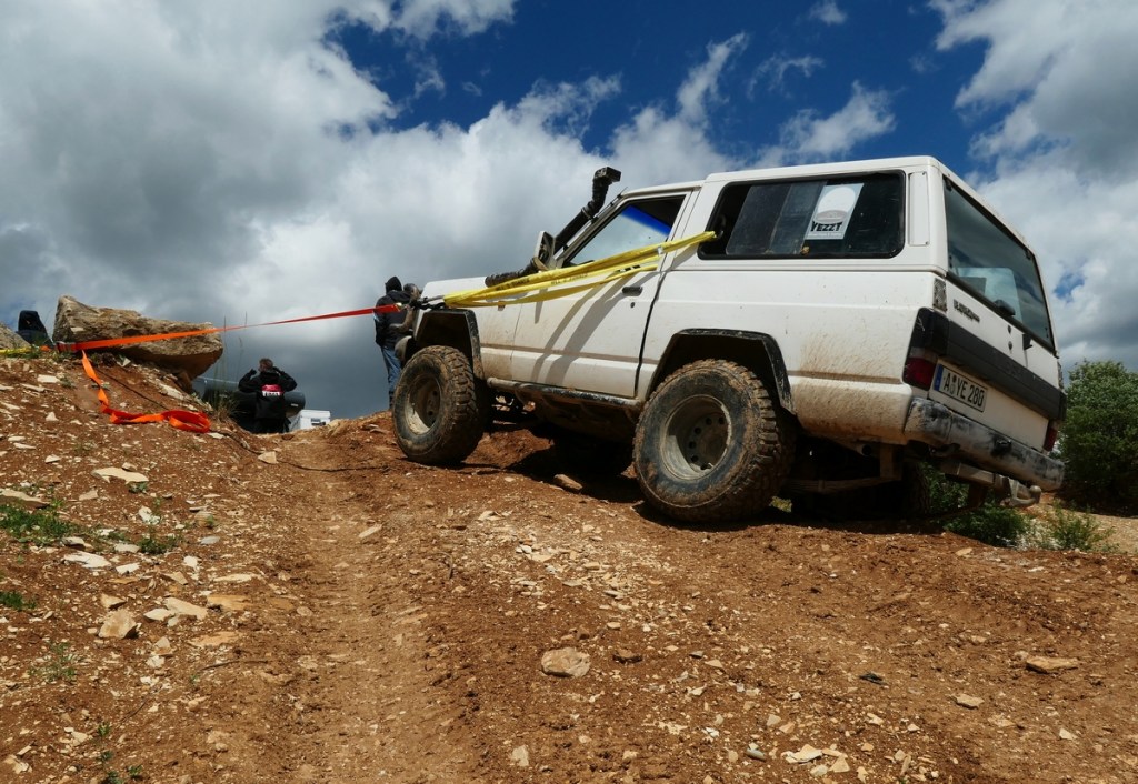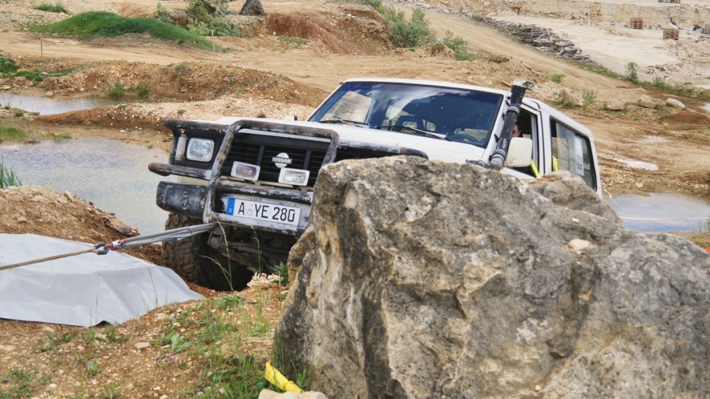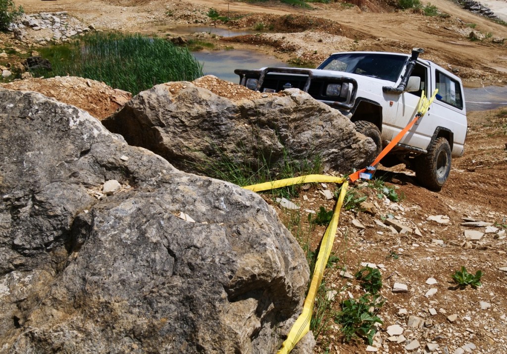 Aber die „richtige“ Bergesituation stellten wir im Gelände nach. Hierfür setzte Moritz, der zweite Instructor, den firmeneigenen Nissan Patrol in einen Hang, von wo aus er nicht mehr alleine wegkam. Mithilfe einer Winsch sollten wir nun die Bergung des Fahrzeugs vornehmen. Zunächst musste natürlich der Patrol so gesichert werden, dass er nicht weiter abrutschen kann. Ein passender Felsen war schnell gefunden und über eine Schlinge an der B-Säule des Autos sicherten wir es mit einem Ratschengurt. Nun mussten wir die eigentliche Bergung vorbereiten. Am zweiten Firmenfahrzeug, einem Mitsubishi L 200, gab es eine Winsch. Aber es schien fraglich, dass der PKW mit dem Gewicht des zu bergenden Autos klarkäme. Deshalb nutzten wir ein weiteres Fahrzeug als „Anker“. So konnten wir dann das Winschenseil in gerader Linie zum Anker führen und von dort aus über eine Umlenkrolle weiter zur Winsch. Trotzdem mussten wir den Mitsubishi an den Rädern zusätzlich mit Steinen gegen ein Wegrollen sichern, so stark war die Kraft, die bei der Bergung nötig war. Es war ein beeindruckendes Schauspiel, das uns da hautnah geboten wurde!