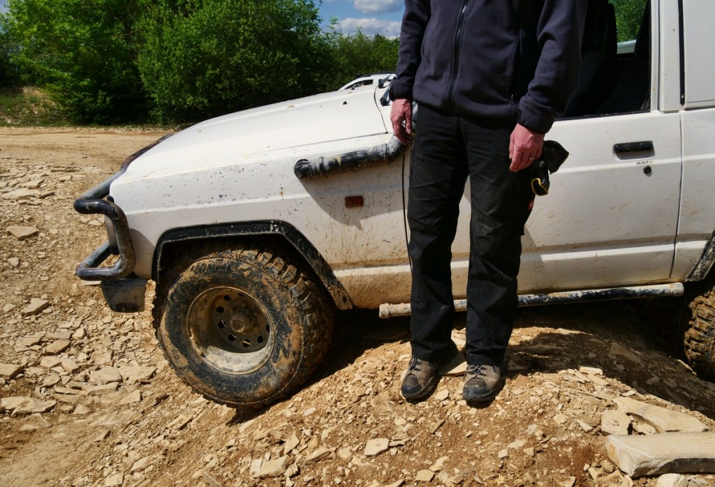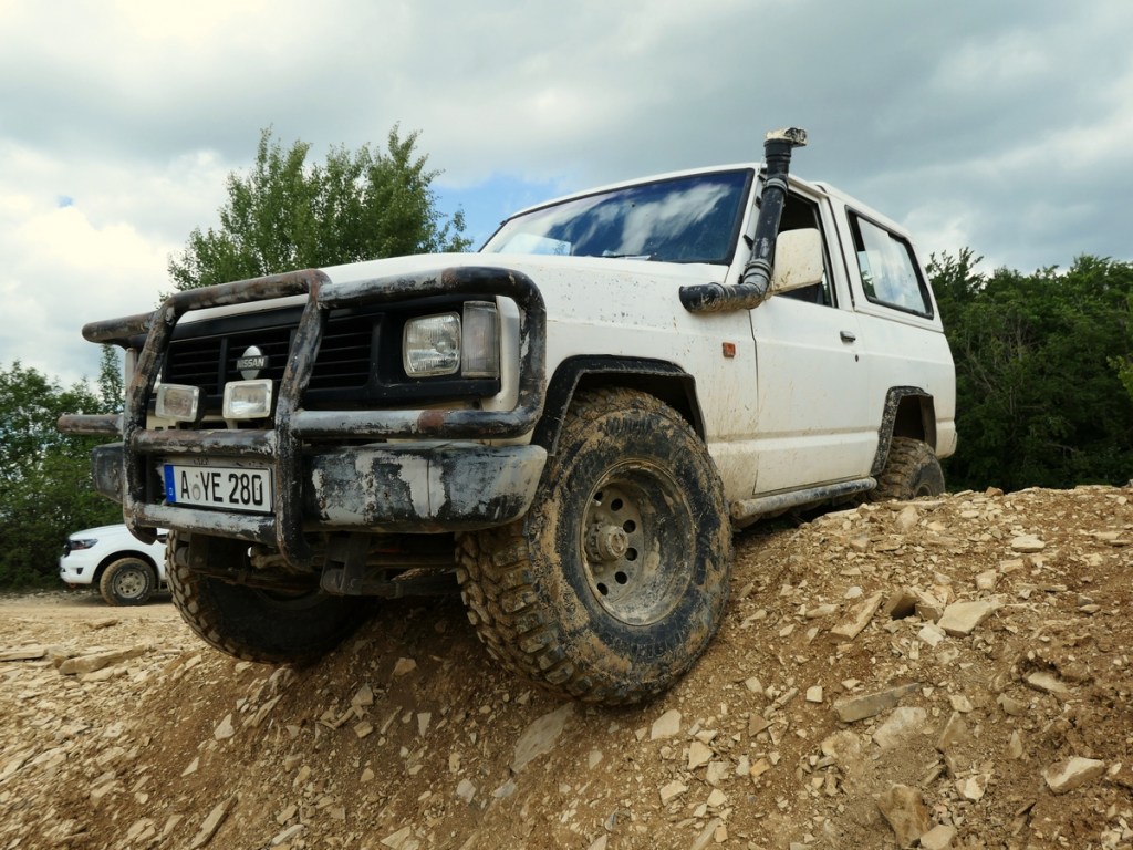 Zuerst begannen wir auf dem großen Parkplatz. Dort machten wir uns mit den spezifischen Offroad-Begriffen und deren Besonderheiten vertraut und lernten den Wendekreis unserer Fahrzeuge sowie deren Spurverhalten in Kurven mit und ohne Allrad sowie mit Differentialsperre kennen. Manches sorgte dabei durchaus für Aha-Erlebnisse. Doch insgeheim warteten wir alle darauf, endlich ins Gelände zu dürfen.