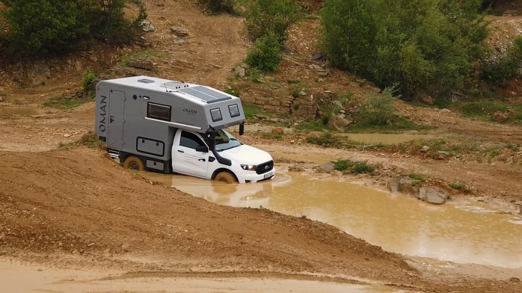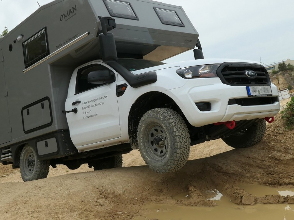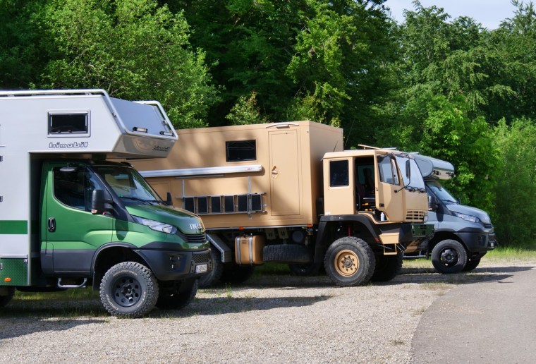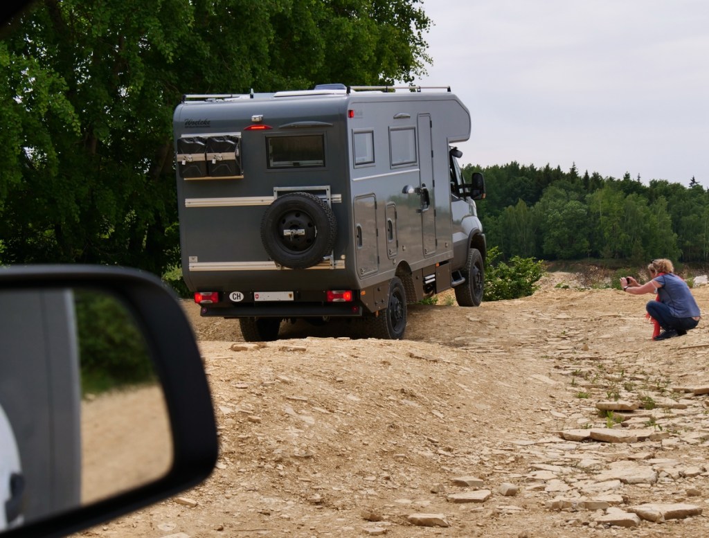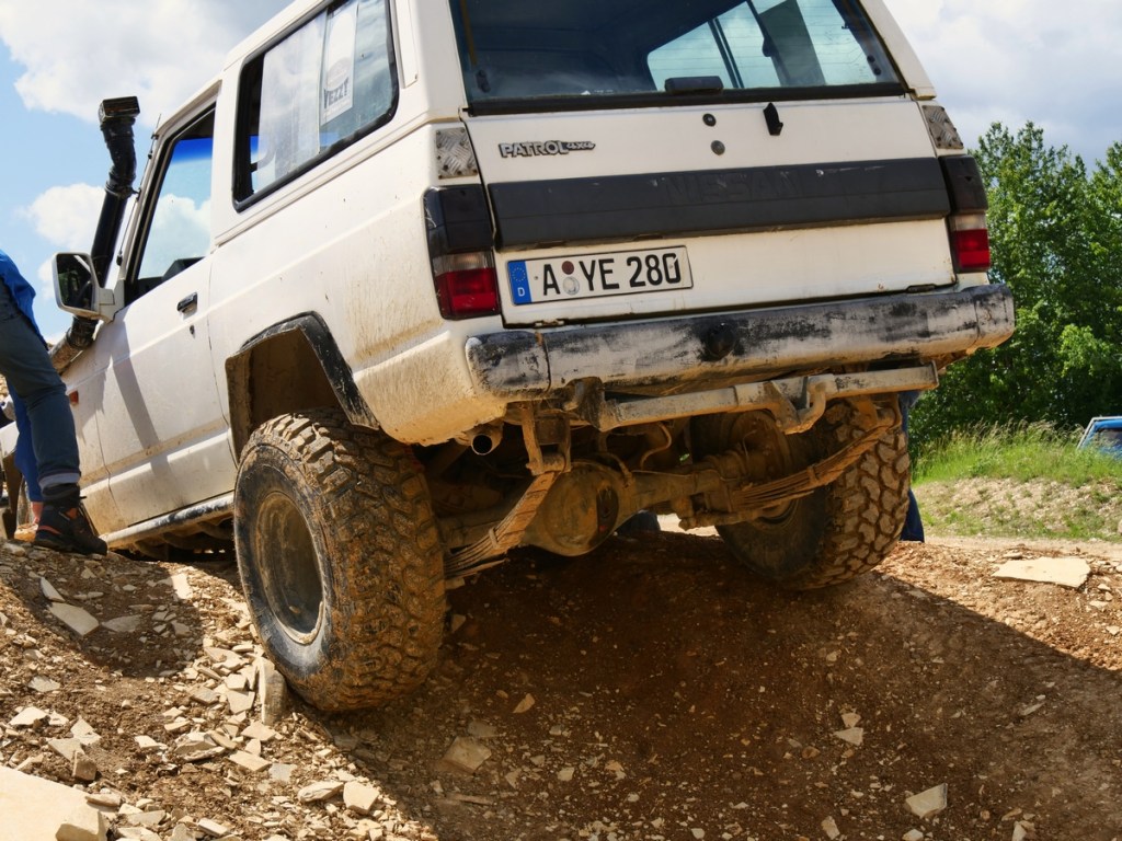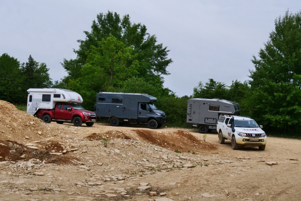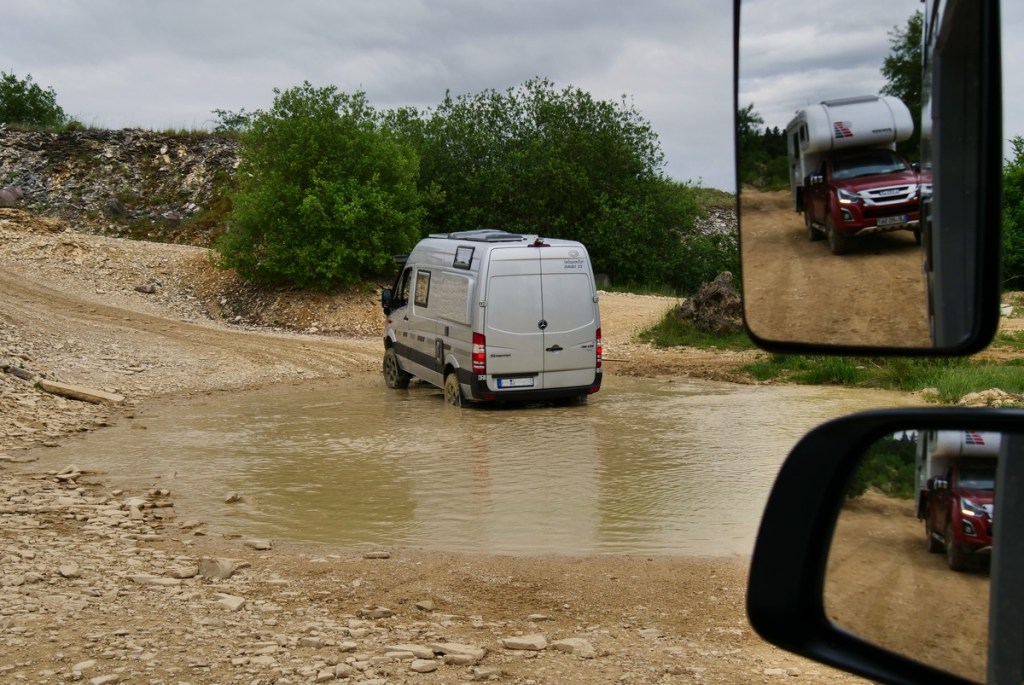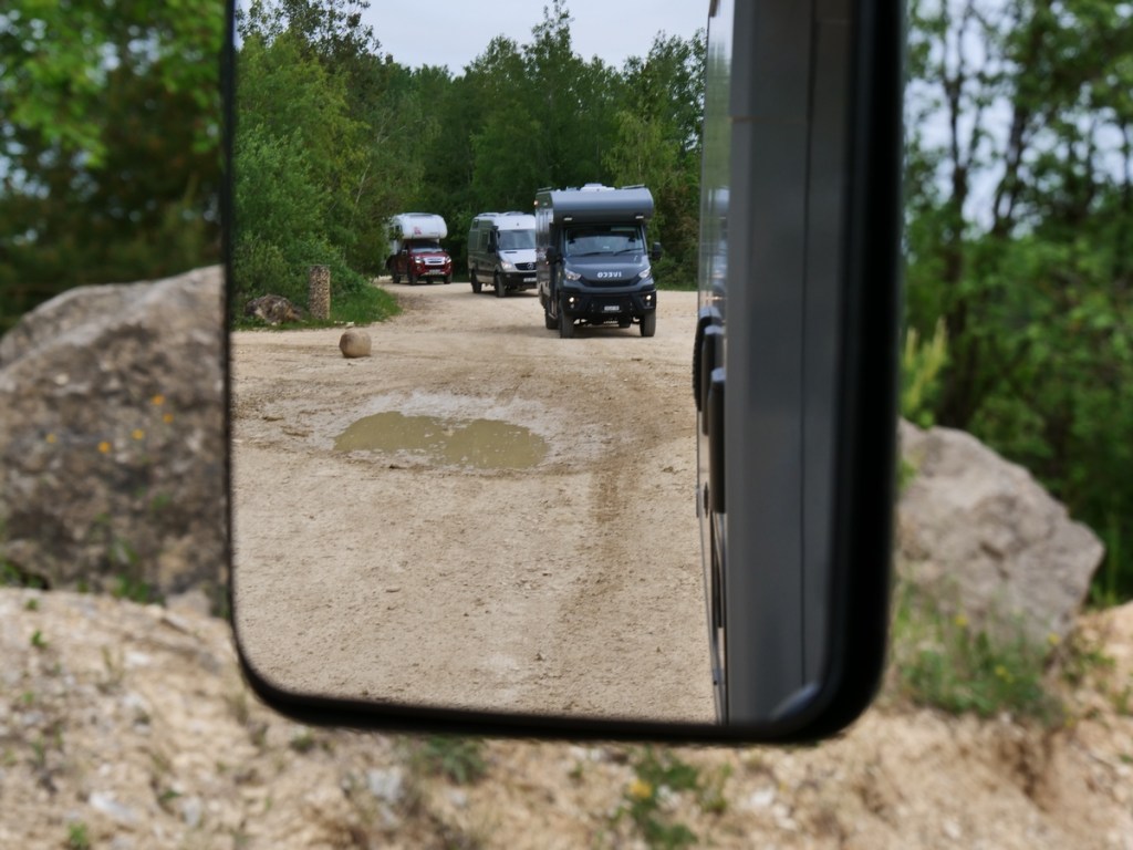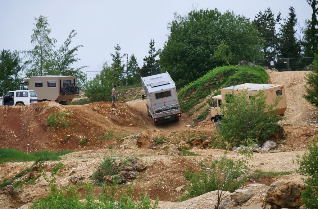 Am Freitag ging es dann in Langenaltheim los. Um zehn Uhr trafen wir mit den anderen Teilnehmern am Treffpunkt ein. Es war ein Kurs speziell für 4×4 Camper und Expeditionsfahrzeuge. Sieben unterschiedliche Fahrzeuge waren am Start: vom Steyr über Unimog und Ivecos bis zu Pickups und Sprinter waren wir eine bunte Truppe, die dann in zwei Gruppen aufgeteilt wurde. In unserer waren dann ein Isuzu Pickup mit einer Tischer Wohnkabine, ein neuer Iveco mit Woelcke Aufbau und ein Mercedes Allrad-Sprinter. Wir waren gespannt, wie unser Oman gegenüber den anderen Fahrzeugen abschneiden würde.