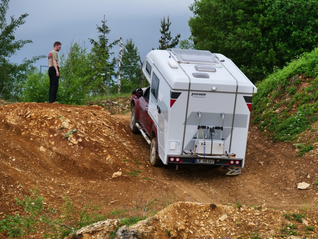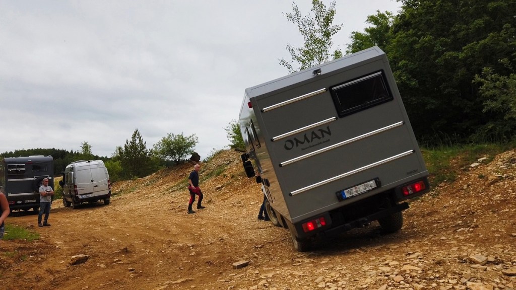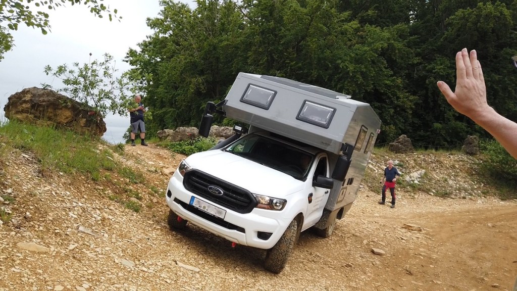 Ein weiterer Trainingspunkt war es zu sehen, wie weit wir das Fahrzeug in die Schräglage bringen können. Hierzu mussten die Fahrer ihre Autos unter der Anleitung Jörgs an den Hang „lehnen“. Er wies sie punktgenau ein und ließ sie so lange höher fahren (eher schleichen), bis es für ihn (oder für den Fahrer) genug war. Erstaunlich, wie schief so ein Camper stehen kann, ohne dass er umkippen würde. Natürlich lernten wir hier auch was zu tun ist, um von diesem Punkt aus gefahrlos wieder herunter zu kommen.