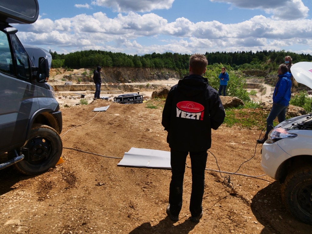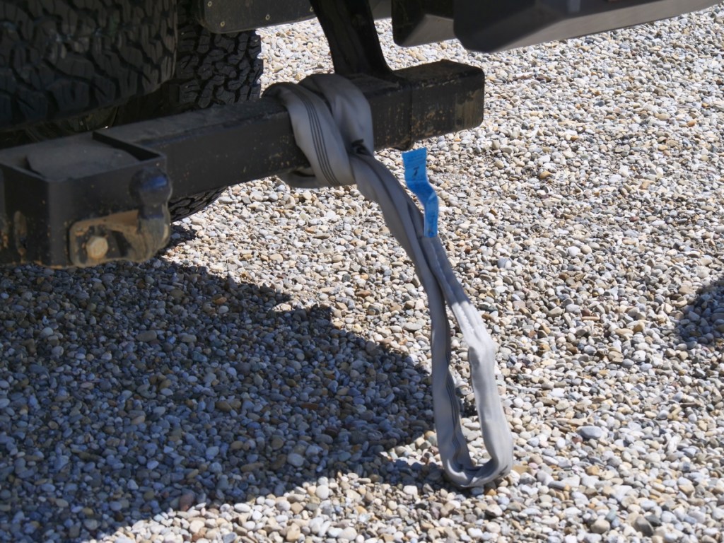 Die ersten Übungen absolvierten wir noch auf dem großen Parkplatz. Wir suchten die besten Befestigungspunkte an unseren Fahrzeugen und ernteten ein Lob für unsere nachgerüsteten Bergeösen. Denn vorne hat der Ranger da normalerweise nicht viel zu bieten. Hinten gibt es keine Probleme, an dem Querholmen des Leiterrahmens kann eine Bergeschlinge gut befestigt werden. Im Praxistest wurde sowohl mit dem Bergegurt als auch mit dem elastischen Seil abgeschleppt.