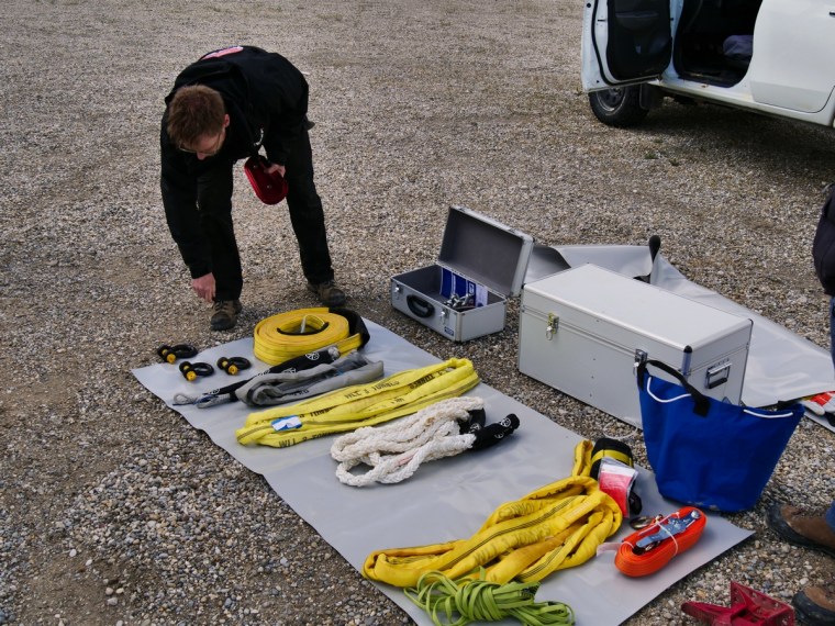 Zunächst lernten wir die verschiedenen Bergeutensilien kennen. Bergegurt, elastisches Bergeseil, Schäkel und Softschäkel, Schlingen, Schaufeln, Hi-Lift Wagenheber und noch diverses Zubehör. In Gedanken überlegten wir schon, was wir für uns wohl bräuchten und vor allem, wo wir das im Kischdle unterbringen könnten!